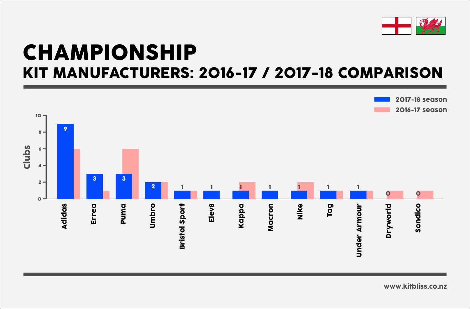 The introduction of Sheffield United from League One and Sunderland and Middlesbrough from the Premier League means three additional adidas teams are playing in the Championship this season. Errea, previously only represented by Norwich City, were similarly boosted by Millwall (promoted from League One) and Queens Park Rangers (previously with Dryworld).