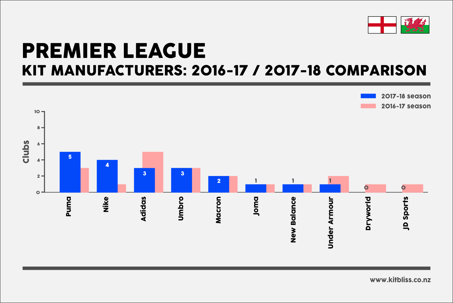Puma were the undoubted beneficiaries of Newcastle United and Huddersfield Town gaining promotion to the Premier League, boosting their numbers from three clubs to five. Though Umbro saw Hull City relegated, they replaced them with AFC Bournemouth whose kit was previously supplied by JD Sports. Under Armour, meanwhile saw their Premier League presence halved when Tottenham Hotspur switched to Nike. The American company also welcomed Brighton and Hove Albion to the Premier League, not to mention the reigning champions Chelsea, who ended their contract with adidas.