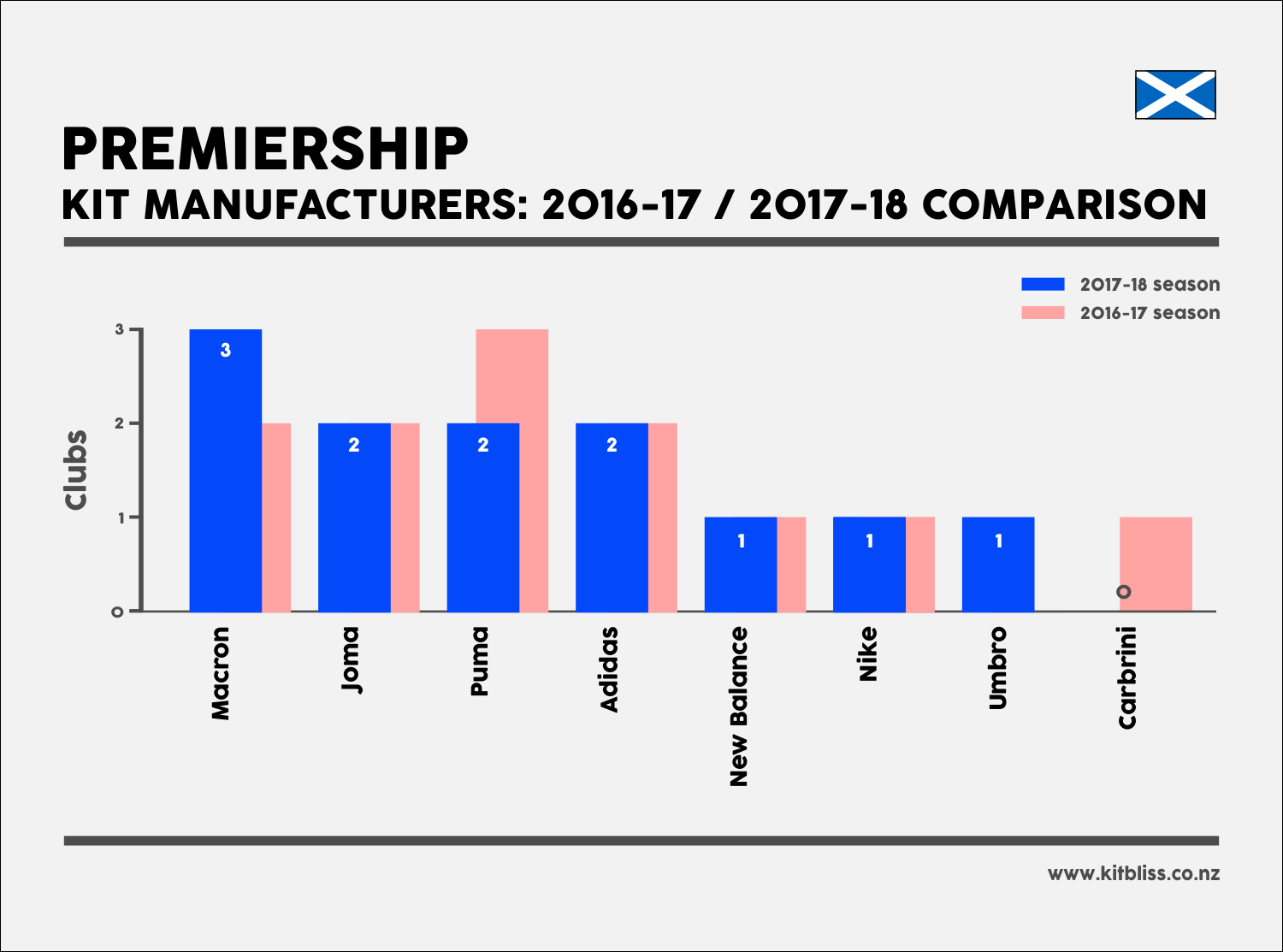 Macron became the most prominent kit manufacturer in the Scottish Premiership having gained the supply contract for Hibernian who were promoted at the end of the 2016-17 season.