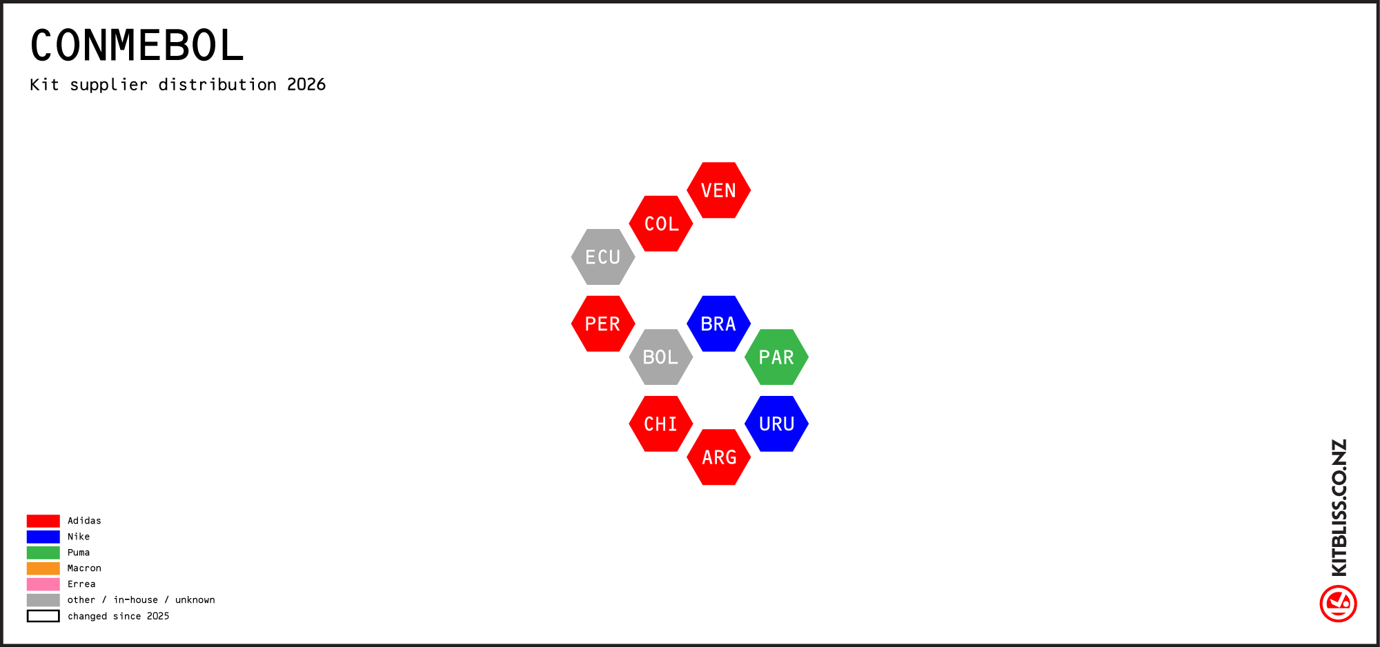 | Adidas | 5 | Argentina, Chile, Colombia, Peru, Venezuela. |