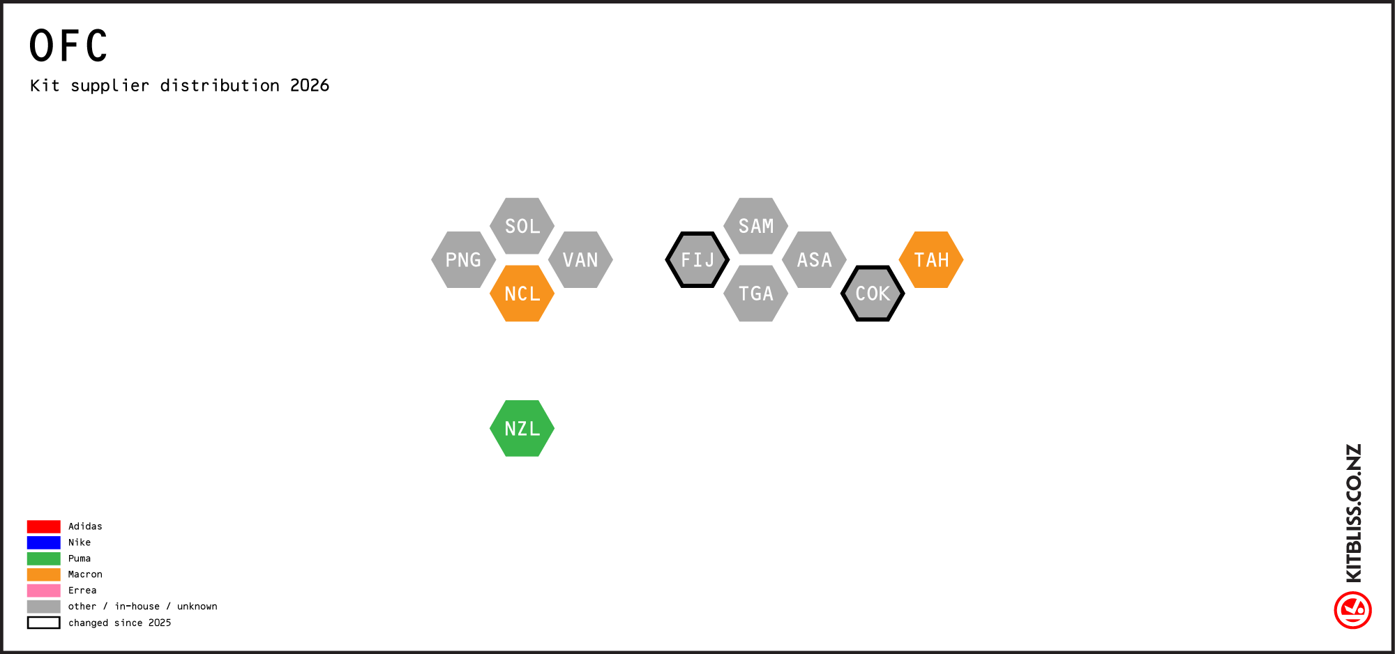 The following table shows each OFC country and the brand that supplied their team kit as per their last game before 1 April 2026.