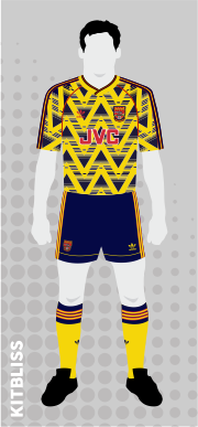 The away kit itself was controversial amongst fans, for the amount of navy in the kit, namely the full sleeves. Previous yellow away shirts had been almost entirely yellow, save for collars, trims and logos – while the sleeve design was said to have been a sneaky attempt to feature more prominent Adidas branding, the club apparently only allowing stripes on the sleeves. A small amount of red around helped make it more 'Arsenal.' This kit was a staple throughout a hugely successful era for the club which often remains hushed due to the manager’s financial issues and no doubt something to do with Perry Groves as well.