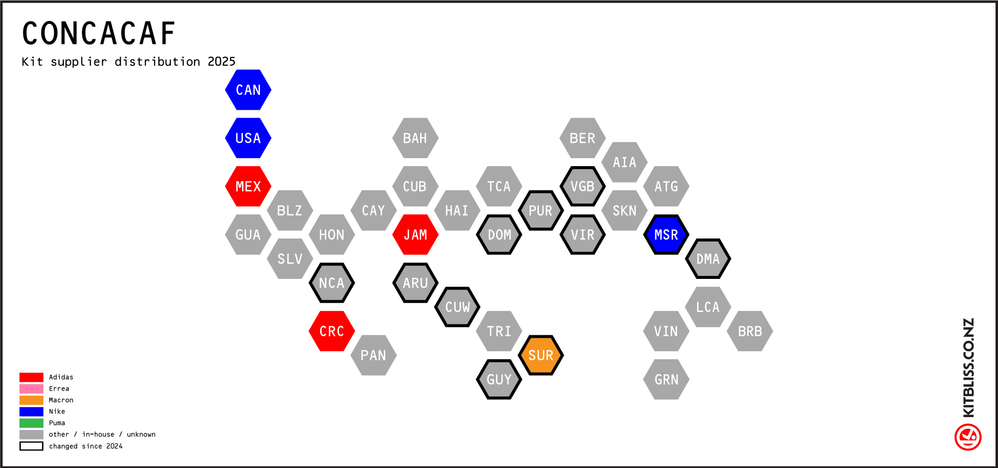 The following table shows each CONCACAF country and the brand that supplied their team kit as per their last game before 1 April 2025.