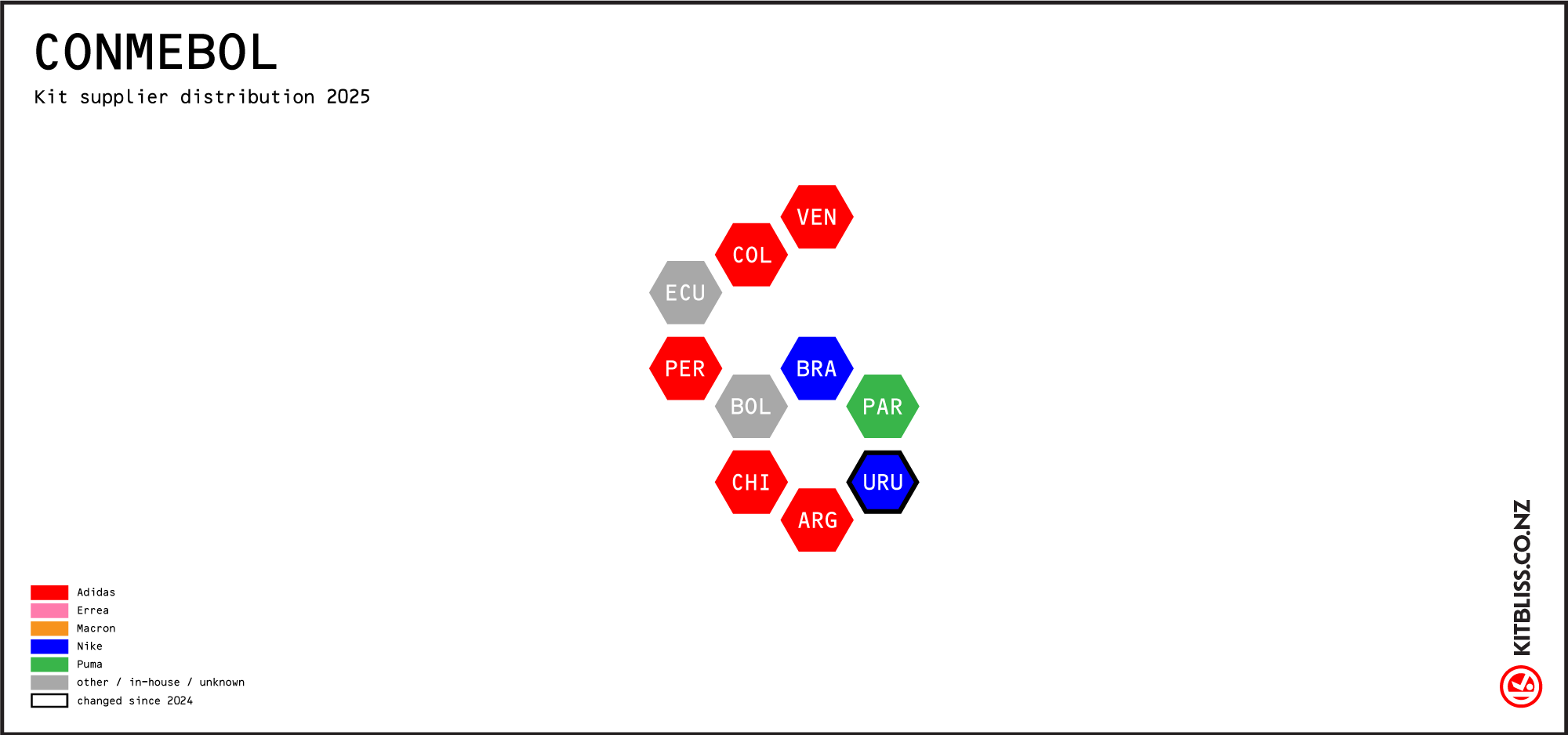 The following table shows each CONMEBOL country and the brand that supplied their team kit as per their last game before 1 April 2025.