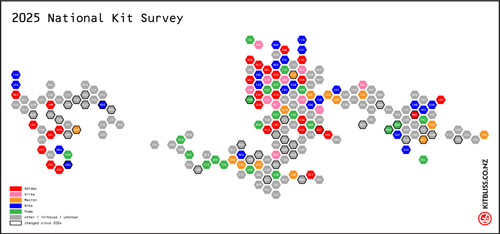 For the second year running, Kitbliss is able to present the supplier of every national team's kit around the world, as worn in its last game prior to 31 March 2025. As last year, the intent was to create a snapshot of who wears what on one specific date every year, so that we can track the trends in popularity of various football kit brands around the world.