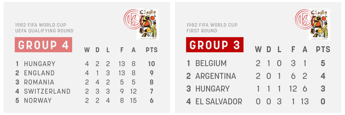 Two months later, Hungary were the 21st of 24 teams to be drawn in a chaotic and error-prone ceremony in Madrid to determine the groups for the finals. Kálmán Mészöly's side were placed in Group 3 along with reigning champions Argentina, 1980 European Championship runners-up, Belgium, and El Salvador, making their second appearance in the World Cup. Getting through to the second round wouldn't be easy, and three points from a possible six wouldn't necessarily be good enough. If it was, a healthy goal difference might make all the difference.